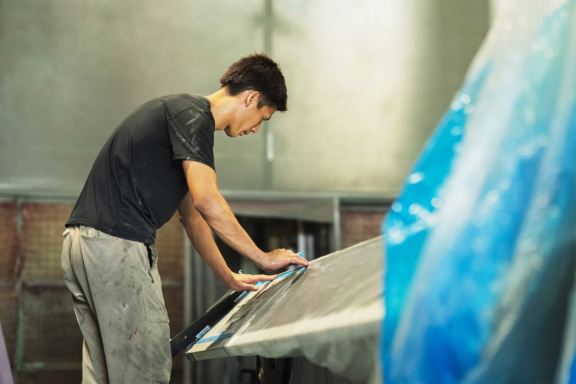 メーカー指定色やブランドカラーを0.1g単位で調整し、光の当たり方や環境条件まで考慮して忠実に再現。10メートル級の車体でも均一な塗膜を仕上げる吹き付け技術や、複雑な形状をミリ単位で処理するマスキング技術など、“メーカー基準に応える品質”を追求。その積み重ねが、大手メーカーからの信頼にも繋がっています。
